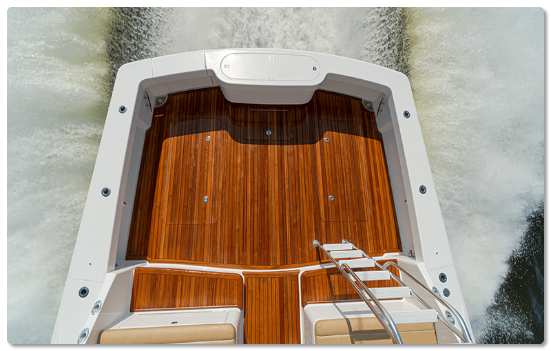 The 140-square-foot cockpit has room for the whole crew or family. Beautiful teak covers the cockpit and mezzanine steps of hull No. 1. She’s ready to fish, with rod holders on the coamings and haunches, a transom live well, a cockpit bait freezer, in-deck insulated fish boxes with overboard drainage and a walk-through transom door and lift gate.